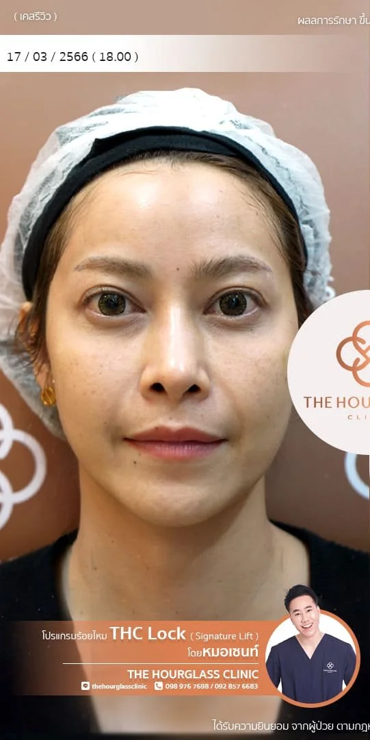 หลังทำทันที : ผลลัพธ์หลังทำการร้อยไหมด้วยโปรแกรมร้อยไหม THC Lock โดยทีมแพทย์ The Hourglass Clinic จะสังเกตได้ว่าใบหน้ากระชับ เข้ารูปมากขึ้นกว่าเดิม ใบหน้าเข้าที่มากขึ้น ใบหน้าส่วนล่างที่หย่อนคล้อยถูกดึงยกขึ้น กรอบหน้าชัด ทำให้ใบหน้าดูเรียวและได้รูป V-Shape มากขึ้น รอยพับร่องแก้มดูจางลง โดยรวมใบหน้าจึงดูสดใสและอ่อนเยาว์ลง